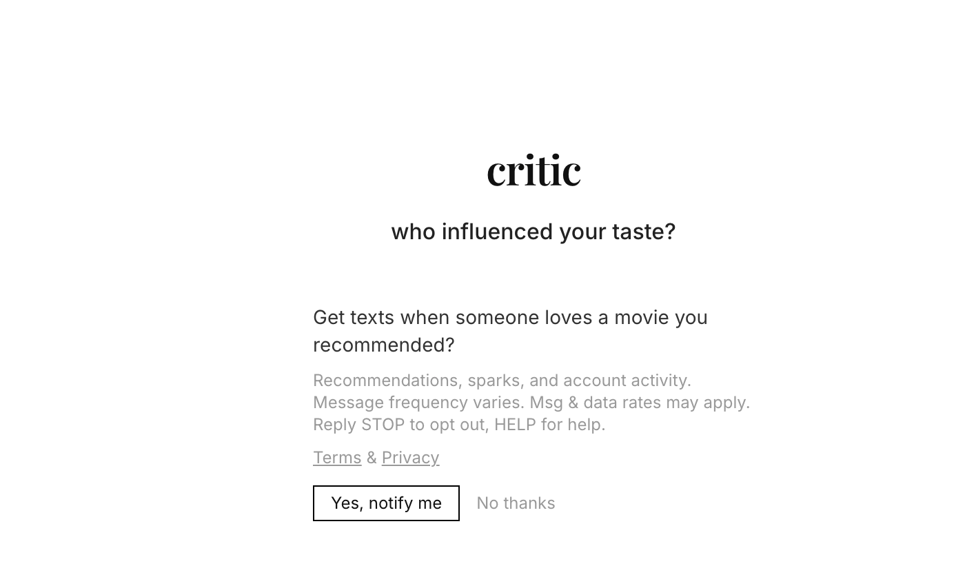 “I agree to receive transactional SMS text messages from Critic, a product of Casting Stats LLC (formerly BlueQuincy LLC), about recommendations, sparks, and account activity. Message frequency varies. Msg & data rates may apply. Reply STOP to opt out, HELP for help.”