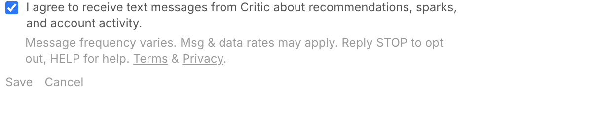SMS consent is collected through two surfaces. Both use an unchecked consent checkbox paired with explicit, verbatim consent language. Consent is optional and is not a condition of using Critic.